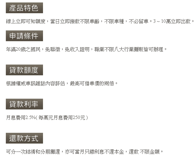 2.利息(以當舖法規定為準) : 月息最低1%~最高2.5%[年利率最低12%最高30%] (提早結清以日計算,無違約金)